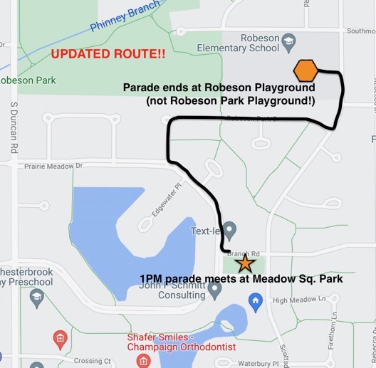 We hope you can join us for the Halloween Parade! Costumed participants are invited to line up on Saturday, October 30, 2021 at 1PM at Meadow Square Park (weather permitting – if there is inclement weather we may reschedule or cancel). We will walk a parade through the neighborhood. We learned from previous years that allowing some of the bigger kids to be on bikes and scooters made it very hard for us to keep the group together. So now we ask that everyone be planning to be on foot . Toddlers and babies can of course be pushed or pulled by family. The map shows the current parade route that we have planned. Please email hannahfromurbana@gmail.com with any questions.
